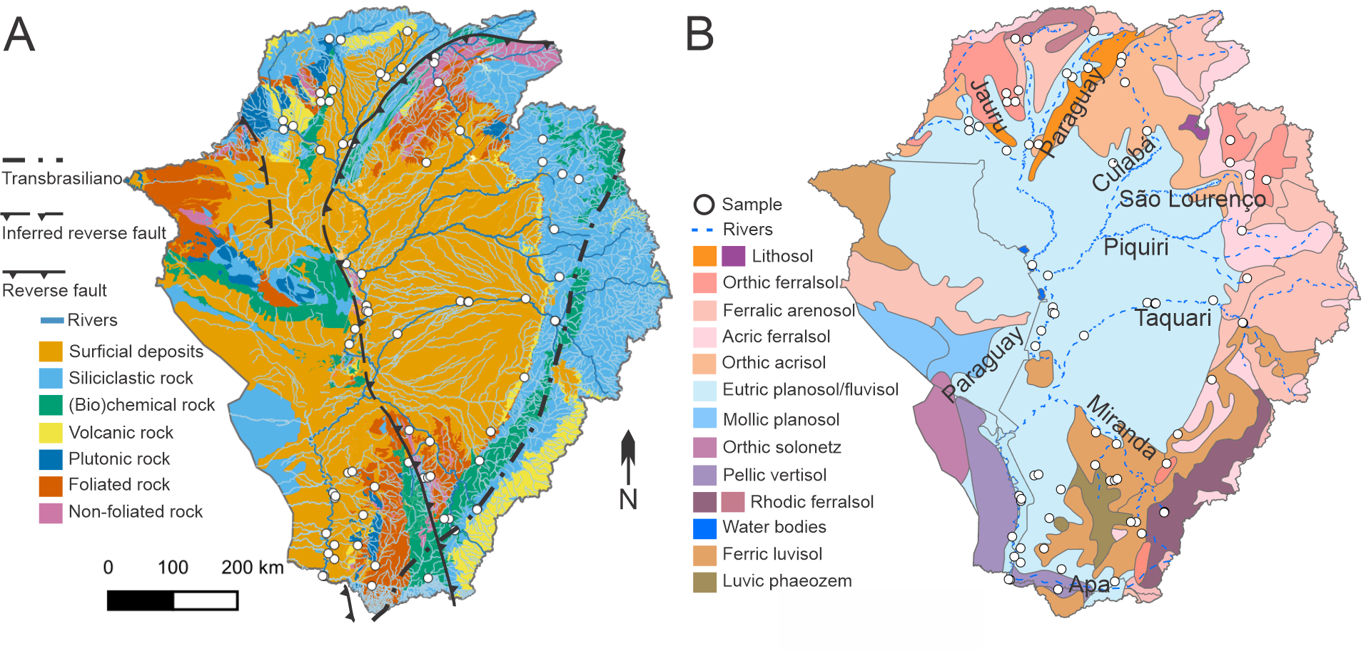 Figure 2. (A) Geology of the Pantanal Basin and drainage network, with major faults. The plateau provenance region is dominated by siliciclastic sedimentary rocks, whereas metamorphic rocks are restricted to the cratons and Paraguay Belt. (B) Soil map for the Pantanal Basin (FAO, 1971). The most widespread soil classes are eutric planosol/fluvisol in the lowlands (Benedetti et al., 2011). Geologic information was obtained for Bolivia (Dirección de Ordenamiento Territorial, Gobierno Autónomo Departamental de Santa Cruz), Paraguay (Vice Ministerio de Minas y Energía), and Brazil (Serviço Geológico do Brasil, CPRM). Faults are based on published studies (Rizzotto & Hartmann, 2012; Warren et al., 2015; Faleiros et al., 2016; Barboza et al., 2018; Rivadeneyra-Vera et al., 2019; Cedraz et al., 2020). White circles represent all sampling stations listed in Table S1. Modified from Lo et al. (2023).