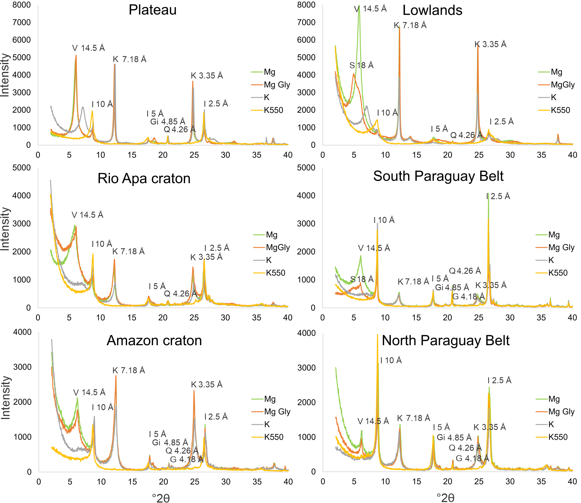 Figure 5. Representative x-ray diffractograms from oriented clay mounts using diagnostic treatments of Mg-, Mg-glycerol, K-25°C, and K-550°C for the six provenance regions detailed in Figure 1B. Diagnostic peaks are labeled for quartz (Q), kaolinite (K), illite (I), smectite (S), vermiculite (V), goethite (G), and gibbsite (Gi). The x-axis showing ° 2θ is identical across all six panels of the figure. Representative samples from each region are Plateau (D4), Lowlands (A3), Rio Apa craton (C6), South Paraguay Belt (E4), Amazon craton (B4), and North Paraguay Belt (F3).