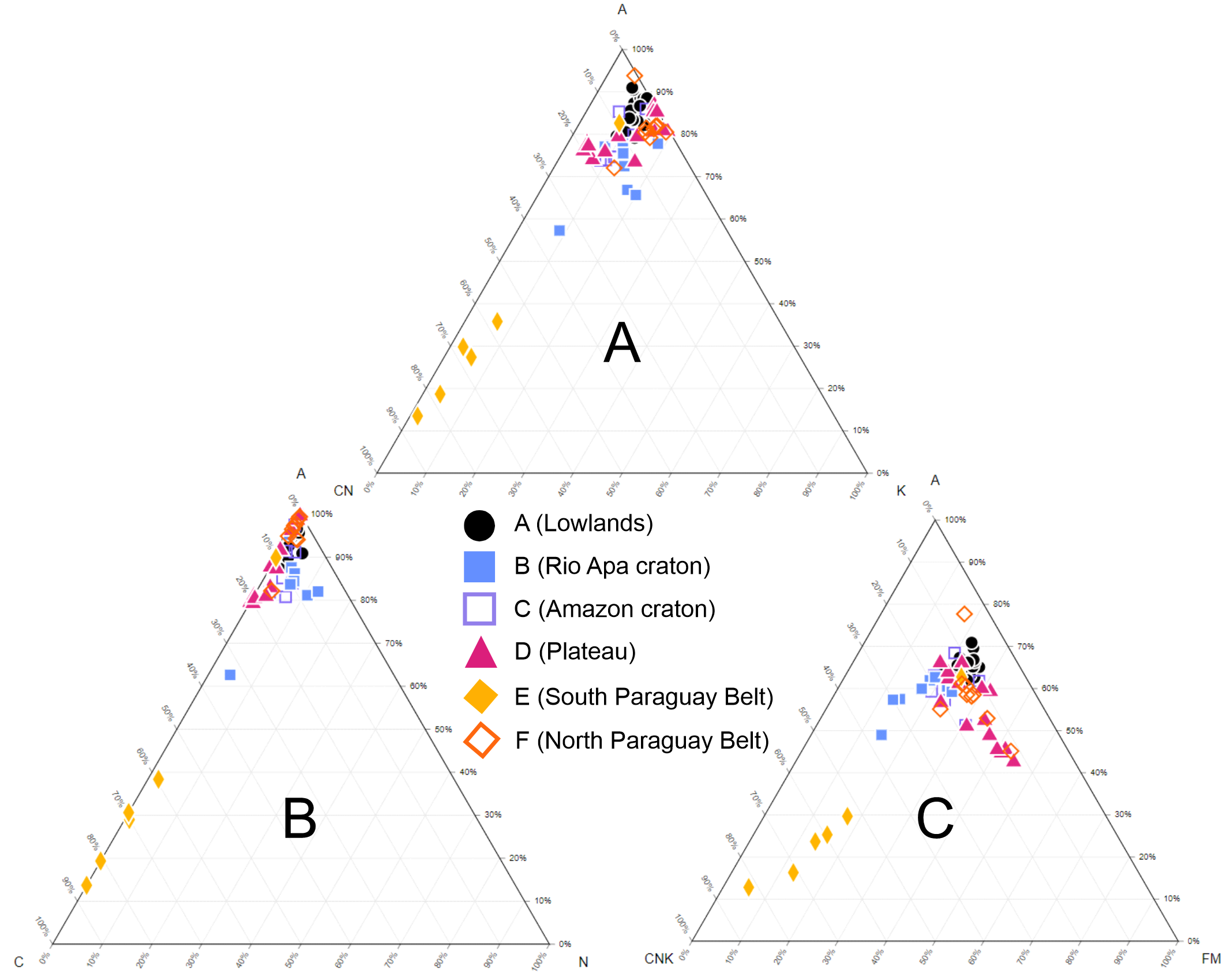 Figure 8. Major elemental compositions of fluvial sediments (n = 66) plotted as molar proportions on Al2O3-(CaO + Na2O)-K2O (ACNK, panel A), Al2O3-CaO-Na2O (ACN, panel B), and Al2O3-(CaO + Na2O + K2O)-(Fe2O3 + MgO) (ACNKFM, panel C). The ACN and ACNK plots form a linear distribution with South Paraguay Belt samples closer to the C- and the CN-pole, respectively. Most mud samples rich in non-mobile Al plot closer to the A-pole. The ACNKFM plot helps distinguish the Mg-rich samples.