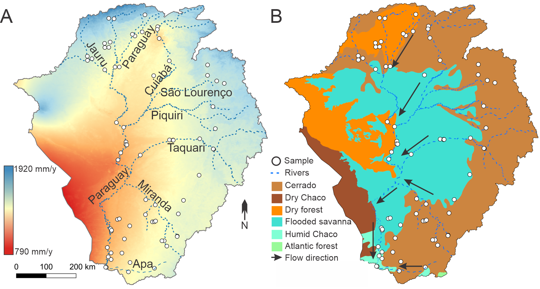 Figure 3. (A) Mean annual precipitation (mm/y) from the WorldClim database (Fick & Hijmans, 2017). In the Brazilian Pantanal, the precipitation is 970 – 1850 mm/y. (B) Vegetation ecoregions regions of the Pantanal Basin (Olson et al., 2001). The primary vegetation of the Pantanal consists of flooded savanna and cerrado (tropical savanna). White circles represent all sampling stations listed in Table S1. Modified from Lo et al. (Lo et al., 2023).