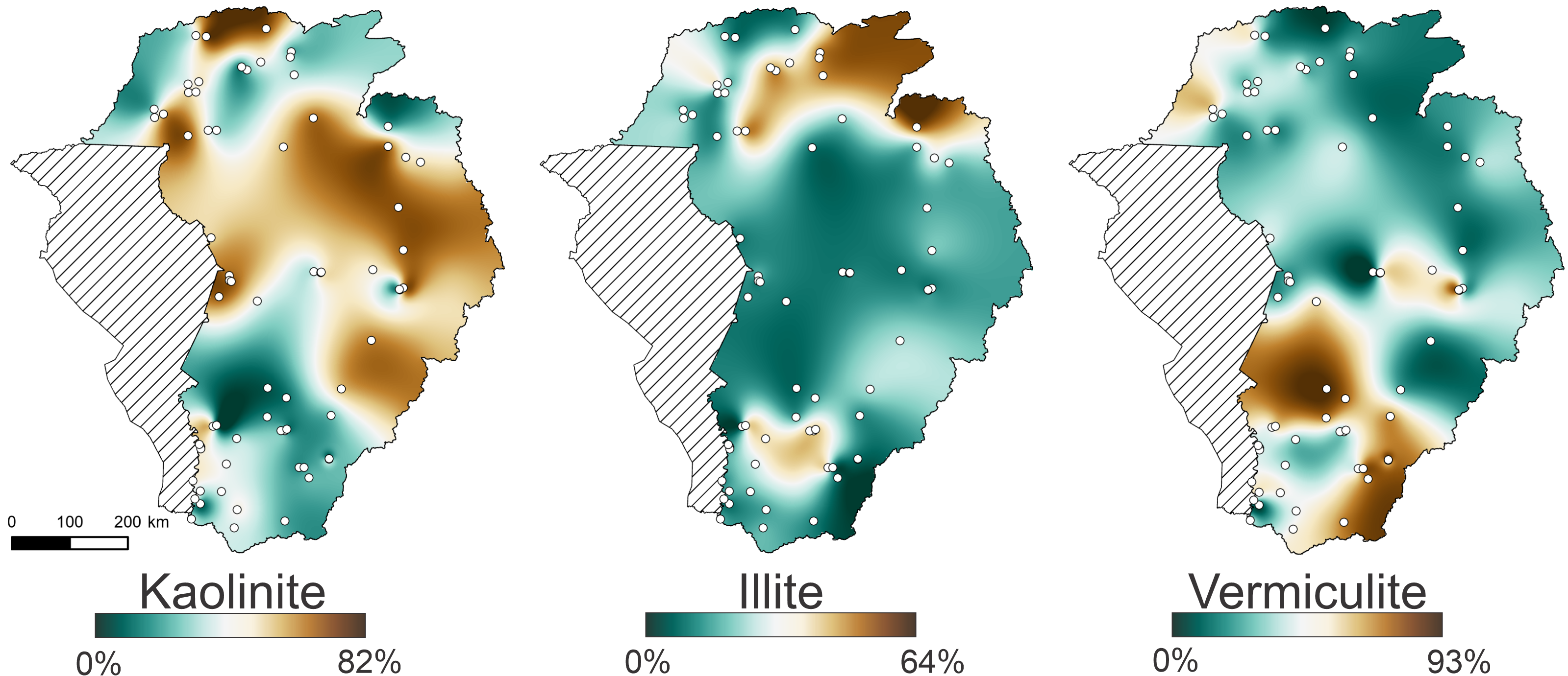Figure 6. Spatial interpolation maps of the major clay mineral constituents at 71 sampling stations in the Pantanal. For each sampling station, the composition was normalized to 100 based on the kaolinite, illite, and vermiculite percent estimates. Interpolation was not extended to hashed areas. See Calibrated XRD data in Supplementary Materials to consult numerical values.