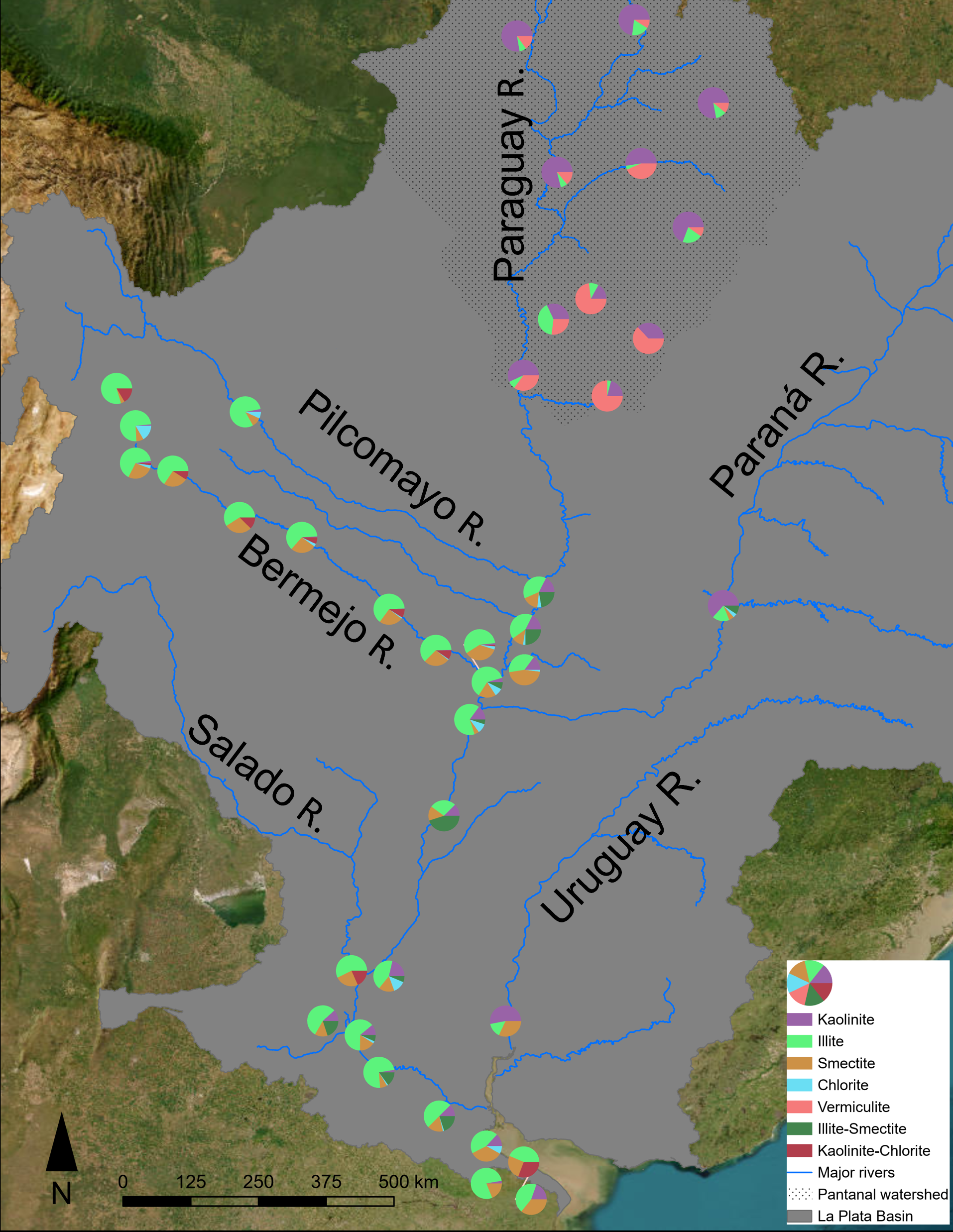| Comments: Kaolinite comprised 50 – 60% of the Paraguay River clays near the basin outlet. Vermiculite composed >30% of the lowland clays downstream of the Rio Apa craton. | ||||||||||||