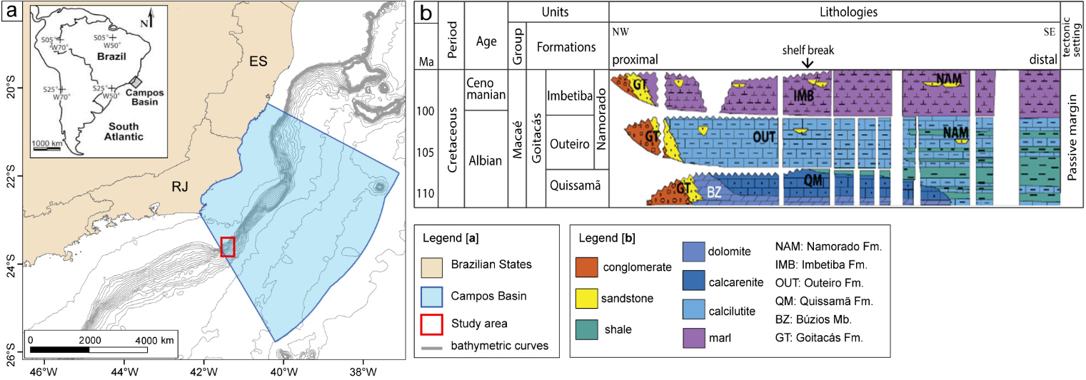 The open marine sedimentary succession of the Campos Basin initiated during the sag tectono-sequence with the deposition of carbonates of the Macaé Group (Albian – Cenomanian). This group comprises the Goitacás, Quissamã, Outeiro, Imbetiba, and Namorado formations. The Goitacás Formation comprises proximal clastic sediments of coastal environments, including alluvial fans, deltas and fan deltas (Winter et al., 2007). The Quissamã Formation primarily consists of packstones and grainstones composed of ooids, peloids, oncoids, and bioclasts, deposited within a NE-oriented shoal system (Guardado et al., 1989). These carbonates were deposited in a shallow neritic environment with a homoclinal carbonate ramp morphology, under moderate to high energy (Dias et al., 1990). The lower carbonates of the Quissamã Formation, directly overlaying the evaporites, are dolomitized and constitute the Búzios Member. The overlying Outeiro Formation comprises intercalations of calcilutites, marlstones, and shales, with sandstone bodies of the Namorado Formation, originating from turbidite flows (Castro & Picolini, 2016). The upper unit of the Macaé Group is the Imbetiba Formation, characterized by marlstones and calcilutites. Both the Outeiro and Imbetiba formations were deposited in deep marine environments (Winter et al., 2007). Overlying the Macaé Group is the Campos Group, which records a marine transgression during the Late Cretaceous, followed by a marine regression. This group is characterized by pelagic and hemipelagic prograding sediments and turbidite deposits (Winter et al., 2007).