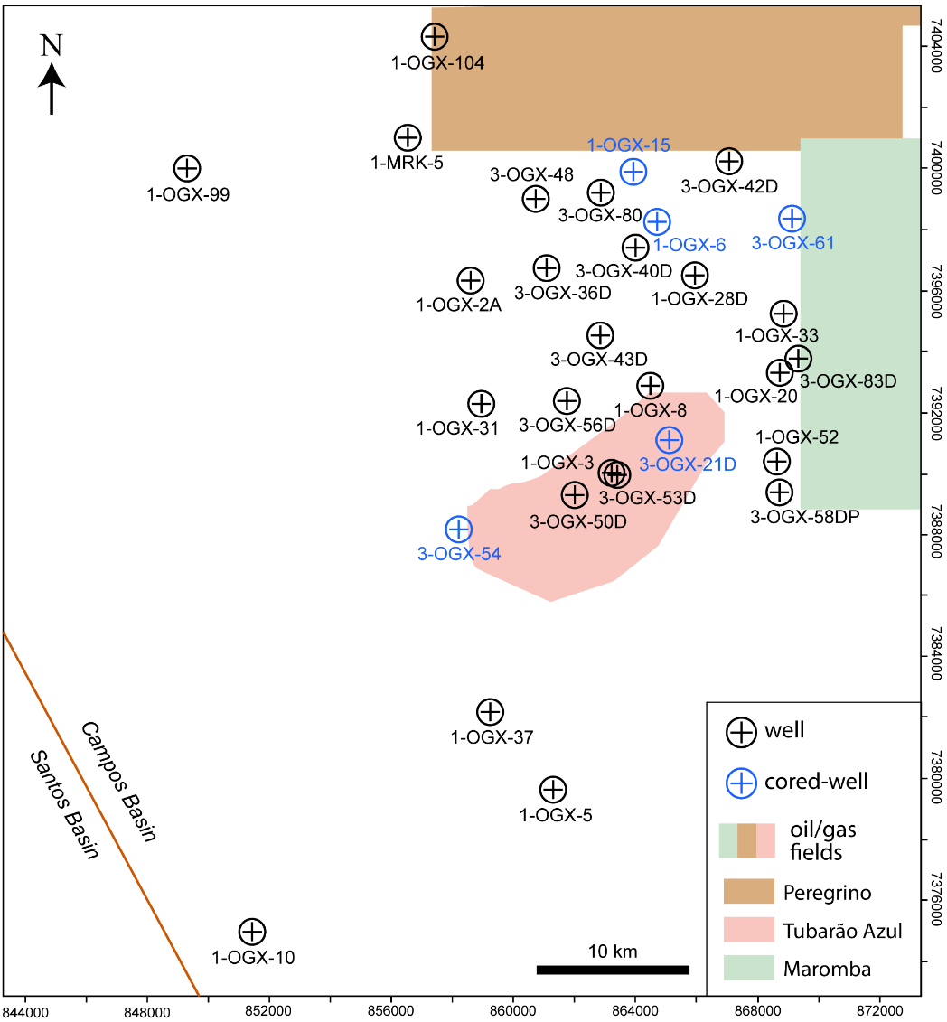 The database of this study consists of 30 boreholes that contain petrophysical logs (e.g., sonic travel time, bulk density, and gamma ray), stratigraphic (i.e., age) and lithology data (Figure 2). Out of the 30 boreholes, 5 contain core of the Quissamã Formation (Albian), totaling 200 m and 475 thin sections.