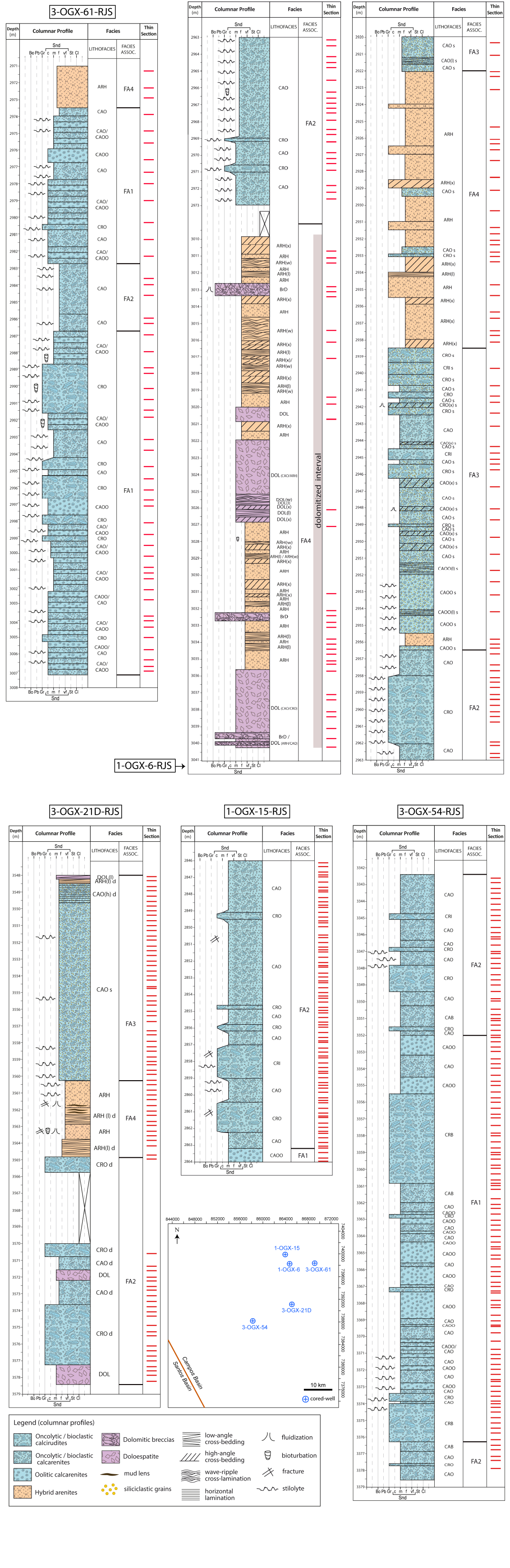 Facies Association 1 (FA1) is present in three of the described cored wells: 3-OGX-61, 1-OGX-15 and 3-OGX-54, and has a maximum thickness of 24.3 m (Figure 3). FA1 predominantly comprises oolitic and oncolytic calcarenites (CAOO and CAO), accounting for 70% of the lithofacies (Figure 9). Oncolytic and bioclastic calcirudites (CRO and CRB), are common (summing 28%), and bioclastic calcarenites (CAB) are rare (2%). The described lithofacies are massive. Bioturbation occurs on well 3-OGX-61, where stylolites and dissolution seams are common.