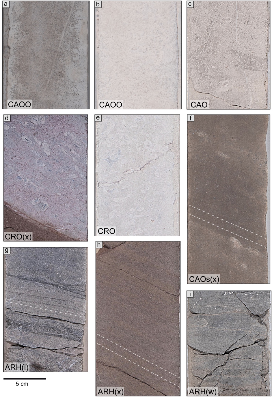 Figure 4. Photos of the cored wells showing eight of the interpreted lithofacies: (A) and (B) oolitic calcarenites; (C) oncolytic calcarenite; (D) oncolytic calcirudite with high-angle cross-bedding marked by the orientation of the bioclasts; (E) oncolytic calcirudite; (F) oncolytic calcarenite with high-angle cross-bedding; (G) hybrid arenite with low-angle cross-bedding; (H) hybrid arenite with high-angle cross-bedding; (I) hybrid arenite with wave-ripple cross-lamination. Dashed white lines in (F), (G), and (H) indicate the angle and direction of cross-bedding.