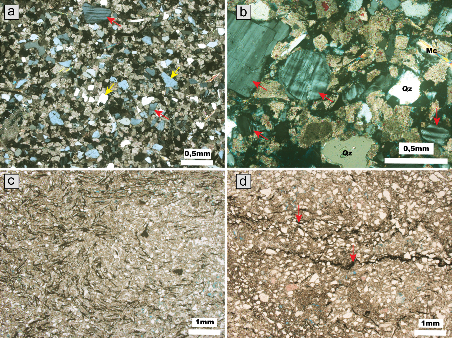 Figure 5. Petrographic features of the dolomitized hybrid arenites. (A) Fine-grained, dolomitized hybrid arenite with angular and subangular grains of monocrystalline quartz and microcline. Crossed polarizers (XP); red arrows indicate K-feldspars, and yellow arrows indicate quartz. (B) Dolomitized hybrid arenite rich in microcline grains (XP); red arrows indicate K-feldspars (microcline); abbreviations: Qz (quartz) and Mc (muscovite). (C) Very-fine grained, bioturbated dolomitized hybrid arenite. Uncrossed polarizers (P). (D) Fine-grained, stylolitized dolomitized hybrid arenite (P); red arrows indicate stylolites.