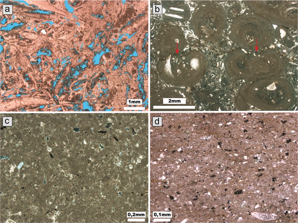 Figure 8. Petrographic features of the carbonates. (A) Bioclastic calcirudite cemented by calcite (stained pink) with moldic and vuggy porosity. Uncrossed polarizers (//P). (B) Compacted oncolitic calcirudite with stylolites (indicated with red arrows) (P). (C) Well-sorted, compacted peloidal calcarenite (//P). (D) Peloidal calcisiltite with microcrystalline pyrite replacing undifferentiated grains (//P).