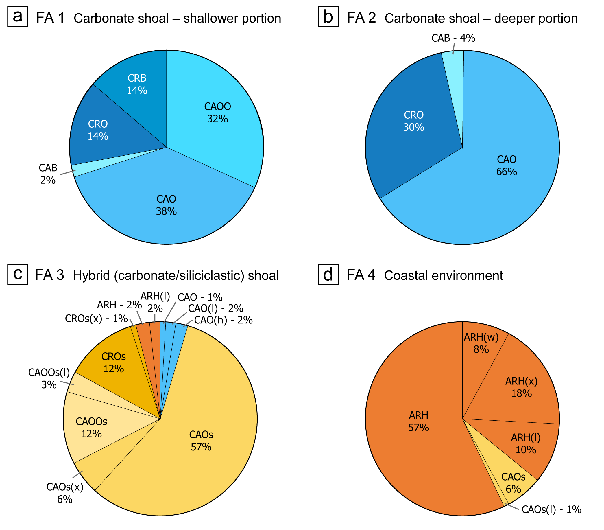 - The identified lithofacies are grouped into four facies associations: carbonate shoal (shallower and deeper portions), hybrid carbonate-siliciclastic shoal and coastal environment. The shallower portions of carbonate shoal predominantly comprises massive oolitic and oncolytic calcarenites, and the deeper portions are mainly composed of massive oncolitic calcarenites and calcirudites. Hybrid carbonate-siliciclastic shoals predominantly present oncolitic and oolitic calcarenites and calcirudites with 10 to 30% of siliciclastic constituents, dominantly massive, or with high- and low-angle cross-bedding. The coastal environment consists mainly of massive hybrid arenites, however sedimentary structures (with high- and low-angle cross-bedding, and wave-ripple cross-lamination) are common.