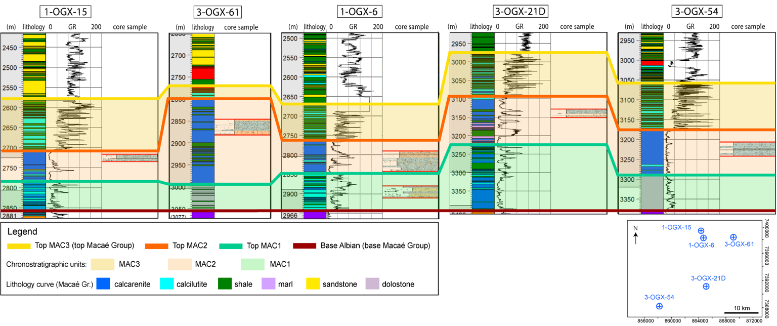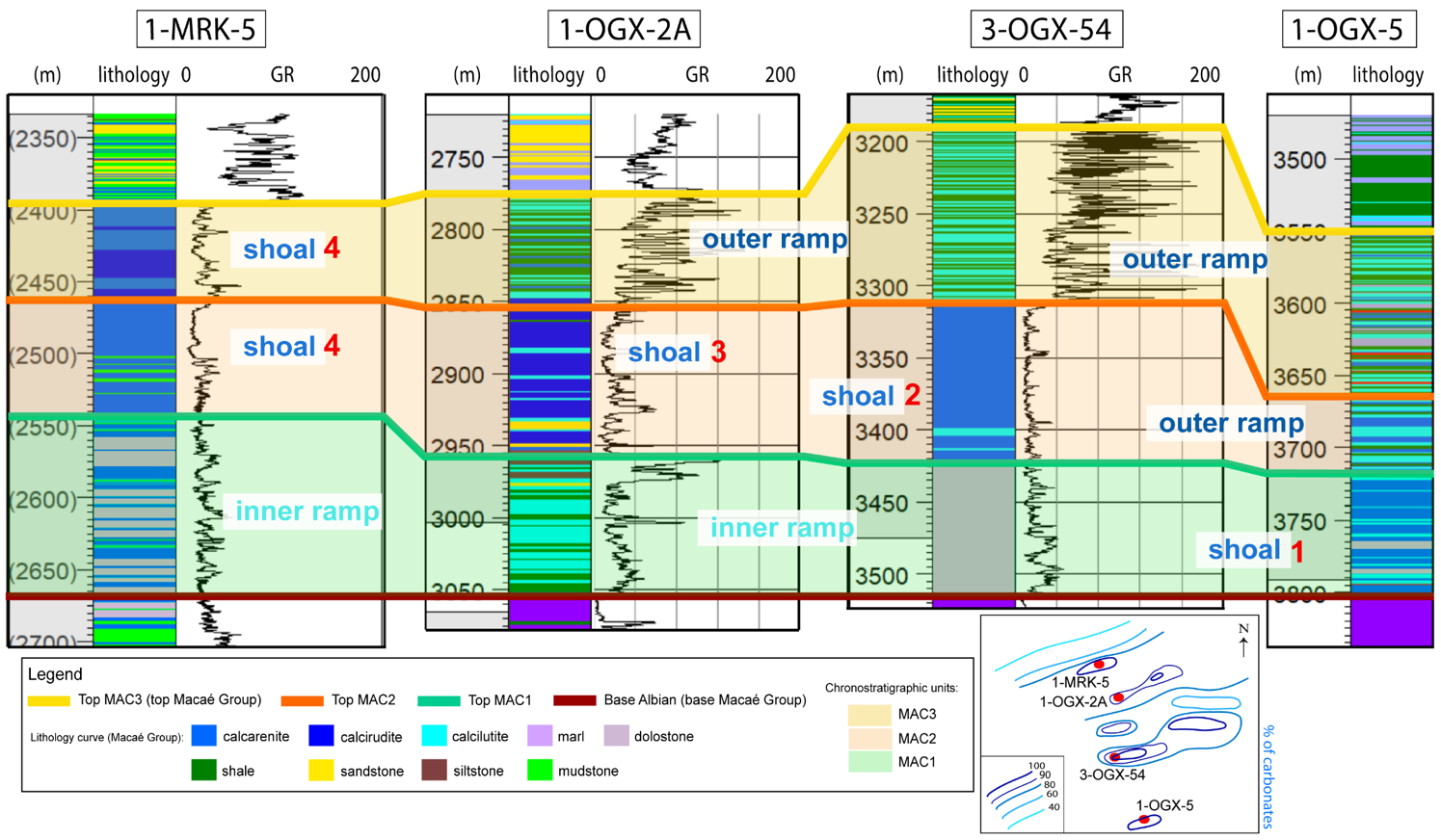 Our work supports the previously published depositional model of the Albian Campos Basin: a carbonate ramp (sensu Burchette & Wright, 1992) sloping toward the east and NE with elongate NE-trending shoals (Guardado et al., 1989). Based on rock and geophysical data, we subdivided the Albian interval of Campos Basin into three chronostratigraphic units separated by flooding surfaces (sensu Catuneanu et al., 2011): MAC1, MAC2 and MAC3, from base to top. The vertical stacking of the units shows continuous retrogradation during the Albian interval of deposition in the basin, indicating a gradual increase in relative sea level and accommodation space.
