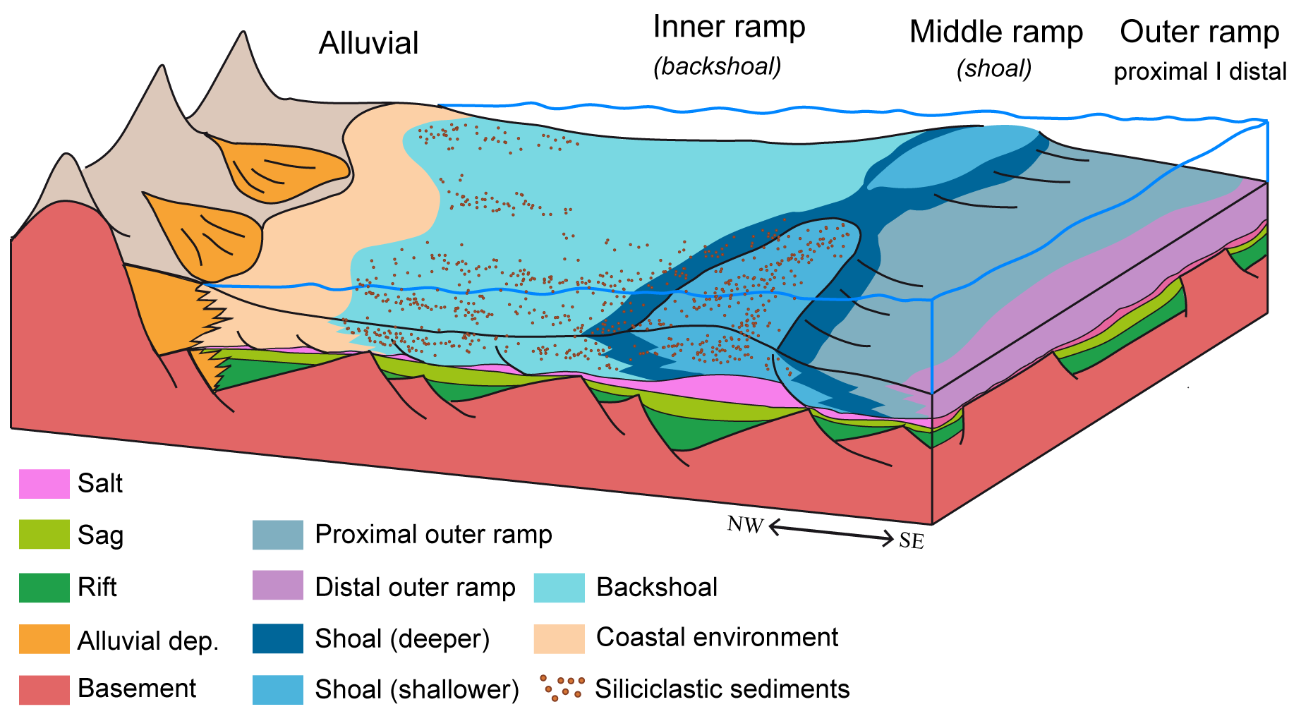 - The depositional model of the SW Campos Basin is a carbonate ramp (sensu Burchette and Wright, 1992) or a rimmed carbonate platform (sensu Bosence, 2005), with significant siliciclastic input locally.