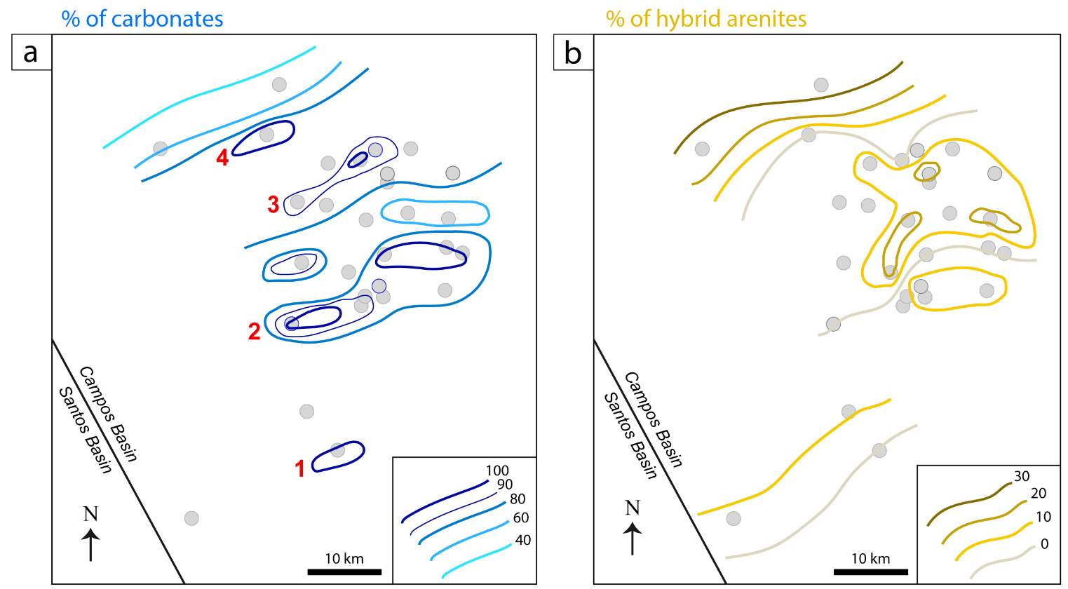 We conclude that carbonate-siliciclastic mixing in the Albian of the Campos Basin occurs in different scales (bed, lithofacies and stratigraphic scales), and is caused by a combination of different factors: (i) in situ mixing related to the interplay between waves and currents transporting and depositing the sediments, resulting in compositional-mixing; (ii) high-frequency cycles of base level rise, causing a retreat of the hybrid system towards the continent; and (iii) salt tectonics influencing sediment dispersal patterns and the development and geometry of shoals.