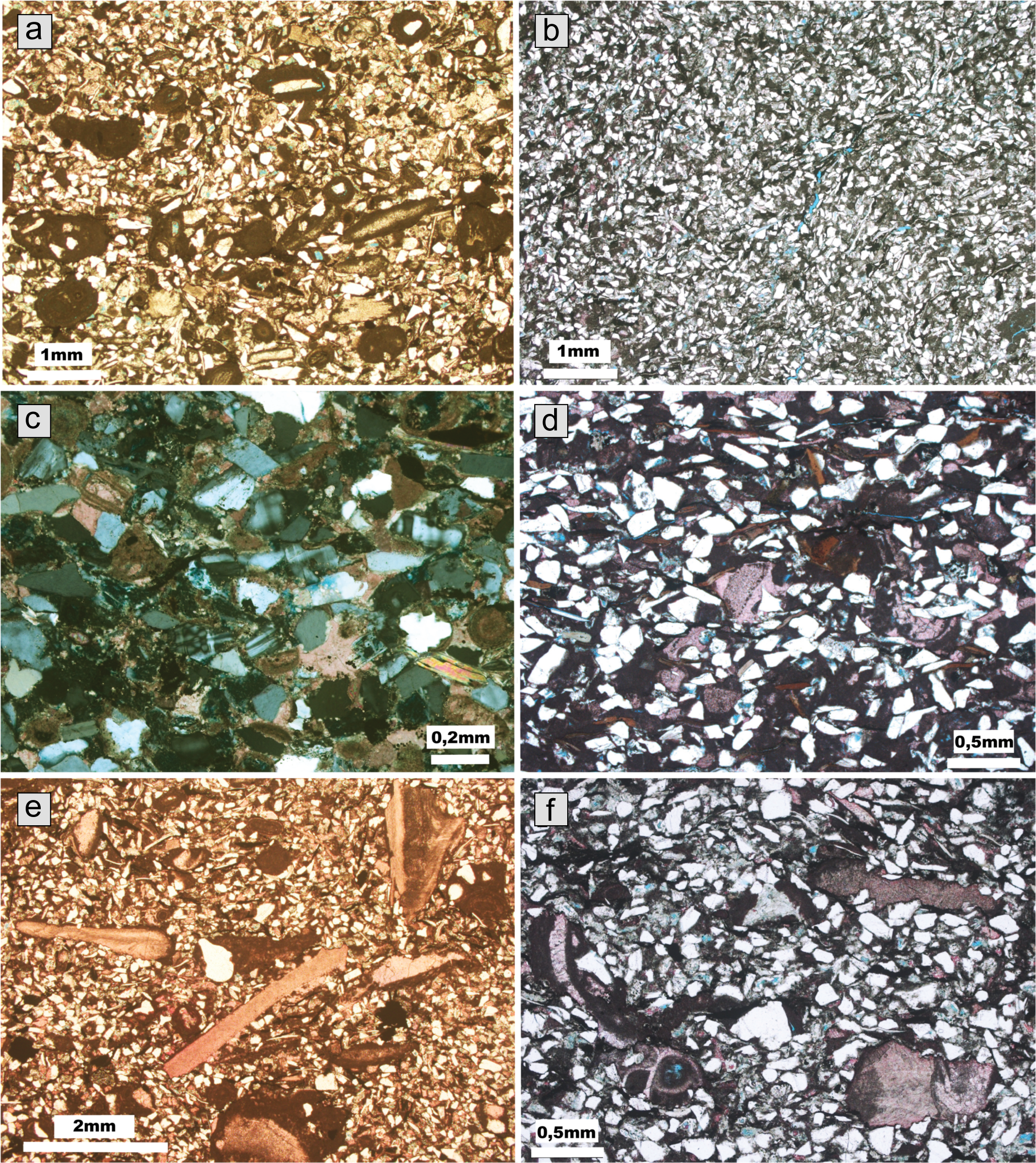 Figure 6. Petrographic features of the hybrid arenites. (A) Fine-grained hybrid arenite constituted by siliciclastic grains and carbonate ooliths, oncoliths and bivalve bioclasts. Uncrossed polarizers (P). (B) Very fine-grained, fluidized hybrid arenite (P). (C) Hybrid arenite rich in K-feldspar grains (microcline). Crossed polarizers (XP). (D) Angular to subangular siliciclastic grains in hybrid arenite rich in peloids (P). (E) Poorly-sorted hybrid arenite with large bivalve bioclasts and oncoliths (P). (F) Compacted hybrid arenite with penetration of the bioclasts by the siliciclastic grains; framework closed by compaction (P).