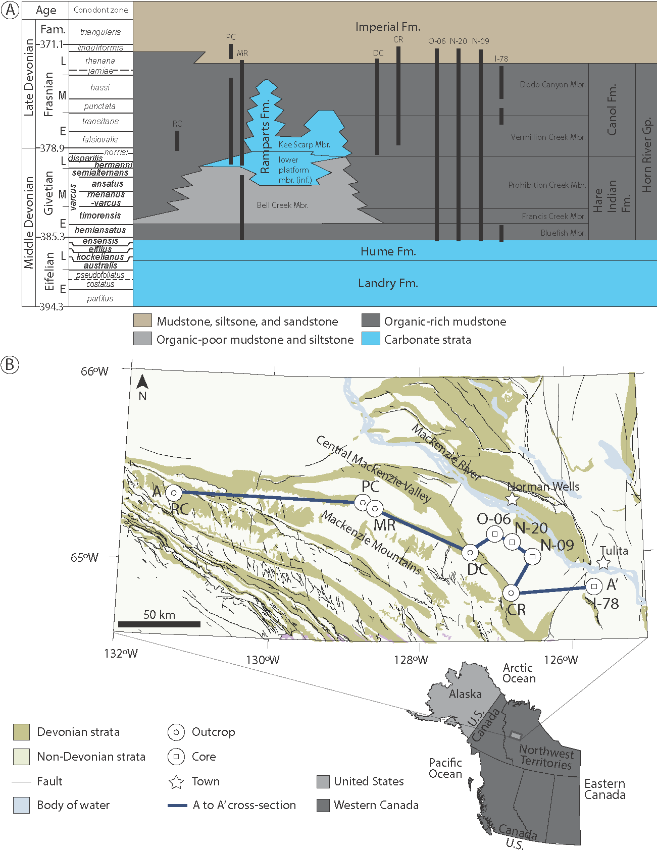 Figure 1. (A) Schematic stratigraphic column for the Horn River Group in the Central Mackenzie Valley and Mackenzie Mountains of the Northwest Territories (NWT). This chart is modified from LaGrange et al. (2023) after Kabanov and Deblonde (2019) and adjusted to the most recent stage boundary calibrations from Becker et al. (2020). The Francis Creek, Prohibition Creek, Vermillion Creek, and Dodo Canyon Members are defined for the Central Mackenzie Valley but have not been established in the Mackenzie Mountains. The black bars show the stratigraphic position and coverage of the cores and outcrops of this study. Lateral spacing of cores and outcrops is not to scale. (B) Geological map of the study area, showing the locations of cores and outcrops in the Central Mackenzie Valley and Mackenzie Mountains of the Northwest Territories (NWT), Canada. The cross-section line A to A’ is also indicated. Modified from Irwin (2020). Outcrop abbreviations: CR – Carcajou River, DC – Dodo Creek, MR – Mountain River, PC – Powell Creek, and RC – Rumbly Creek. Other acronyms and abbreviations: Fam. – Famennian, Fm. – formation, Gp. – group, Mbr. – member, inf. – informal.