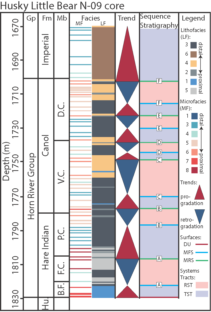 Figure 3. Microfacies (MF) and lithofacies (LF) results for the Husky Little Bear N-09 core. Interpreted depositional trends are shown to the left, along with interpreted sequence stratigraphic surfaces and systems tracts. Microfacies were interpreted from thin sections by Biddle et al. (2021), with each microfacies line on this figure representing data from one thin section. Acronyms and abbreviations: Gp – group; Fm – Formation, Mb – Member; Hu. – Hume; B.F. – Bluefish; F.C. – Francis Creek; P.C. – Powell Creek; V.C. – Vermillion Creek; D.C. – Dodo Canyon; DU – drowning unconformity; MFS – maximum flooding surface; MRS – maximum regressive surface; RST – regressive systems tract; and TST – transgressive systems tract.