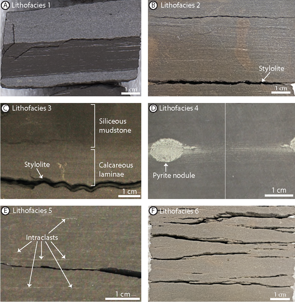Figure 2. Representative photographs showing the six lithofacies identified in the Horn River Group and overlying Imperial Formation of our studied cores. (A) Tentaculitoid grainstone intercalated with calcareous to calcareous siliceous mudstone in Lithofacies 1 at a depth of 1823.3 m in the Bluefish Member of the Hare Indian Formation of the N-09 core. (B) A calcareous mudstone of Lithofacies 2 from the N-09 core at a depth of 1777.3 m in the Vermillion Creek Member of the Canol Formation. (C) Lithofacies 3 at 1749.2 m in the Vermillion Creek Member (Canol Formation) of the O-06 core. The image shows a siliceous mudstone with calcareous laminae. (D) A siliceous mudstone characteristic of Lithofacies 4 at 1677.7 m in the Dodo Canyon Member (Canol Formation) of the O-06 core. (E) Intraclast-rich laminae in a mudstone sample of Lithofacies 5 from the I-78 core at 1829.2 m in the Dodo Canyon Member of the Canol Formation. (F) A fissile, argillaceous mudstone of Lithofacies 6 at 1696.3 m from the N-09 core in the Imperial Formation.