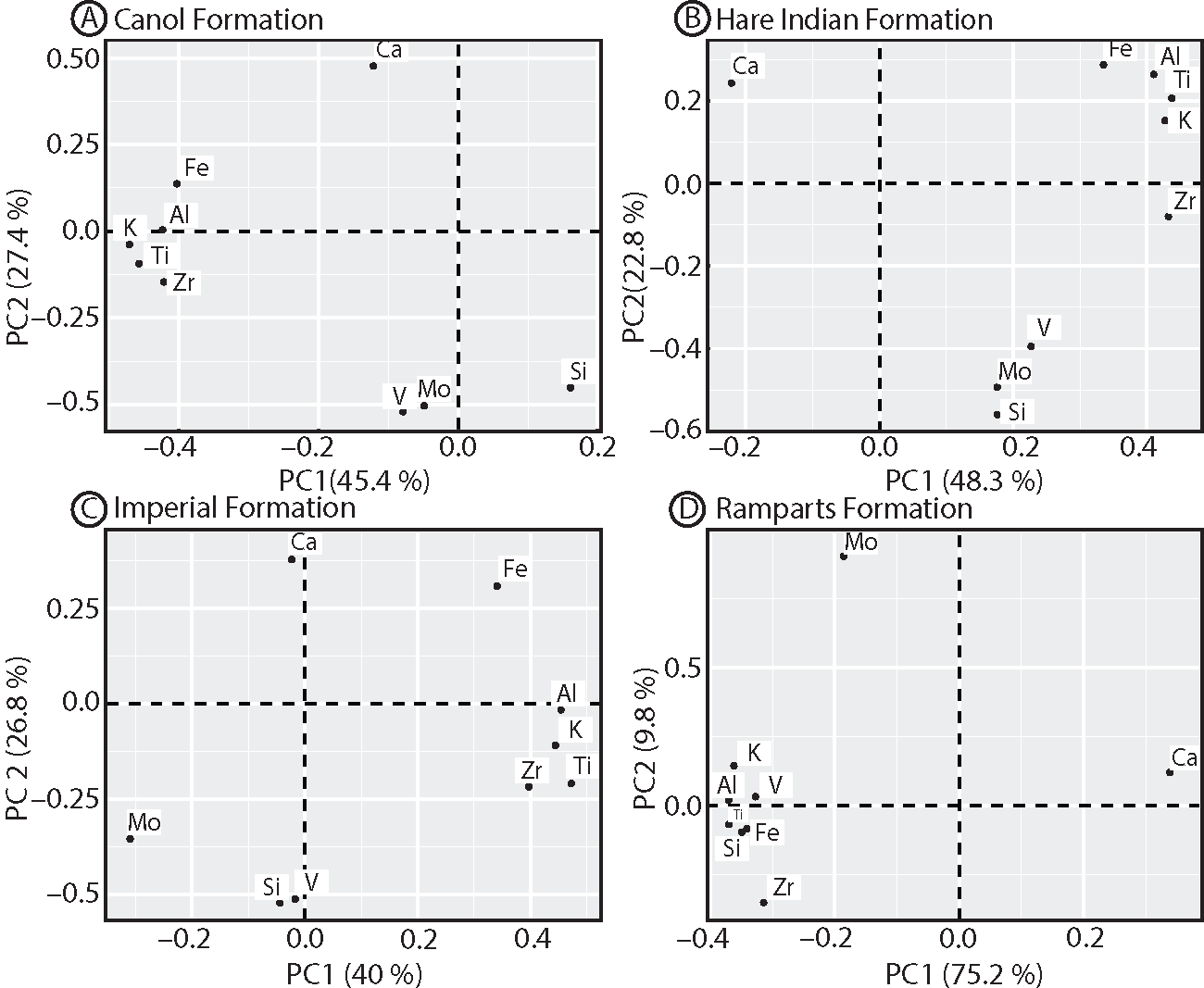 PCA results from the Horn River Group (Hare Indian, Canol, and Ramparts Formations) and the lowermost Imperial Formation are displayed in Figure 4. Principal component 1 (PC 1) explains 45.4 % of the variance in the Canol Formation dataset, 48.3 % of the variance in the Hare Indian Formation, 40 % in the Imperial Formation, and 75.2 % in the Ramparts Formation. Principal component 2 (PC 2) accounts for 27.4 %, 22.8 %, 26.8 %, and 9.8 % of the variance in the Canol, Hare Indian, Imperial, and Ramparts Formations datasets, respectively. In all four plots, Al, Fe, K, Ti, and Zr are clustered together (Figure 4). In the Canol, Hare Indian, and Imperial Formations, Mo and V plot near one another, although in the Ramparts Formation, V covaries with Al, K, Ti, and Zr rather than Mo (Figure 4). Silicon is present in a similar zone to V and Mo in the Canol, Hare Indian, and Imperial Formations, but plots near Al, K, Ti, and Zr in the Ramparts Formation.