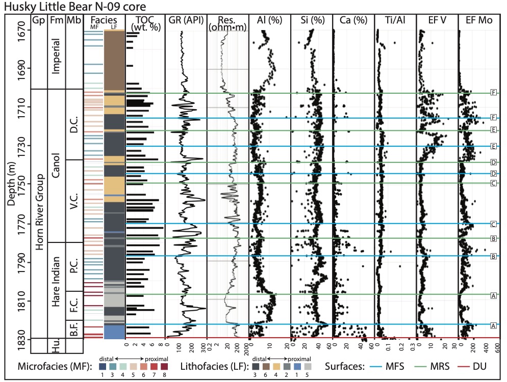 Figure 5. Microfacies (MF), lithofacies (LF), total organic carbon (TOC), gamma-ray log, resistivity log, and X-ray fluorescence results for the Husky Little Bear N-09 core. Microfacies were interpreted from thin sections by Biddle et al. (2021), with each microfacies line on this figure representing data from one thin section. The solid line on the resistivity plot represents shallow resistivity (10”), whereas the dashed line is associated with deep (90”) resistivity. Acronyms and abbreviations: Gp – group; Fm – Formation, Mb – Member; Hu. – Hume; B.F. – Bluefish; B.C. – Bell Creek; F.C. – Francis Creek; P.C. – Powell Creek; V.C. – Vermillion Creek; D.C. – Dodo Canyon; MF – microfacies; LF – lithofacies; TOC – total organic carbon; GR – gamma ray; Res. – resistivity; EF V – V enrichment factor; EF Mo – Mo enrichment factor; MFS – maximum flooding surface; MRS – maximum regressive surface; and DU – drowning unconformity.