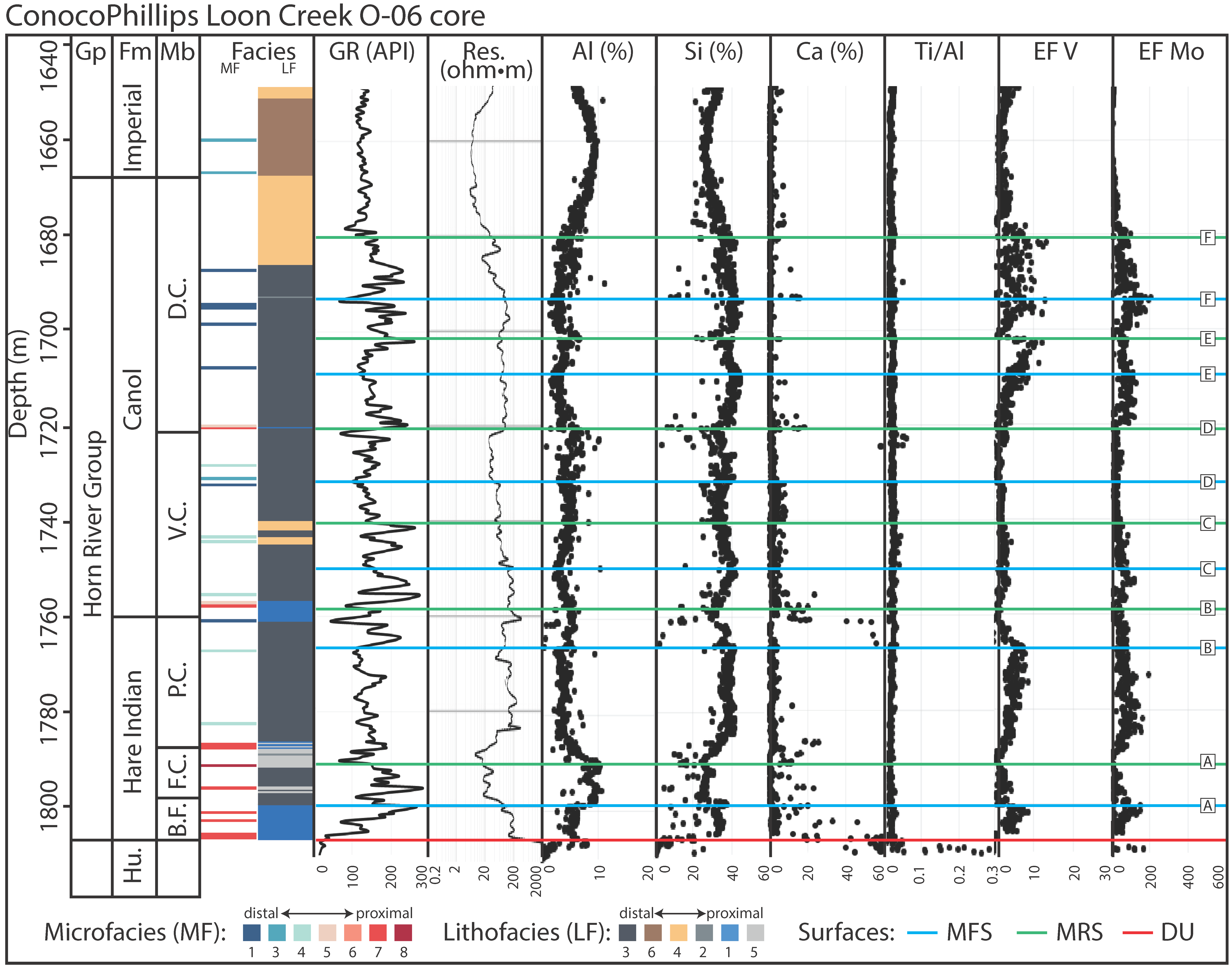 Figure 6. Lithofacies, gamma ray log, resistivity log, and X-ray fluorescence (XRF) results for the ConocoPhillips Loon Creek O-06 core. The solid line on the resistivity plot represents medium depth resistivity (30”), whereas the dashed line is associated with deep (90”) resistivity. Acronyms and abbreviations: Gp – group; Fm – Formation, Mb – Member; Hu. – Hume; B.F. – Bluefish; B.C. – Bell Creek; F.C. – Francis Creek; P.C. – Powell Creek; V.C. – Vermillion Creek; D.C. – Dodo Canyon; MF – microfacies; LF – lithofacies; TOC – total organic carbon; GR – gamma ray; Res. – resistivity; EF V – V enrichment factor; EF Mo – Mo enrichment factor; MFS – maximum flooding surface; MRS – maximum regressive surface; and DU – drowning unconformity.