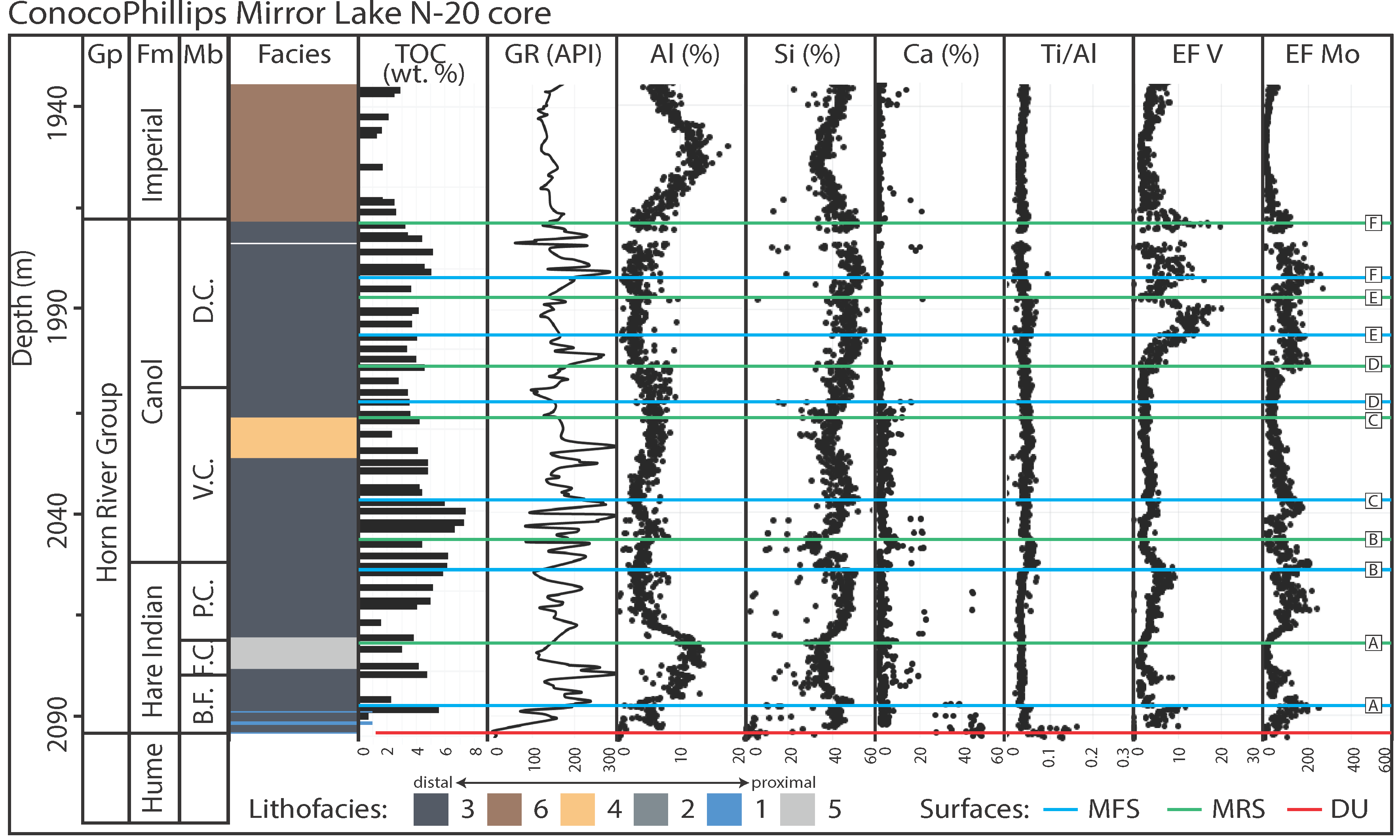 Figure 7. Lithofacies, total organic carbon (TOC), gamma ray log, and X-ray fluorescence (XRF) results for the ConocoPhillips Mirror Lake N-20 core. Acronyms and abbreviations: Gp – group; Fm – Formation, Mb – Member; B.F. – Bluefish; F.C. – Francis Creek; P.C. – Powell Creek; V.C. – Vermillion Creek; D.C. – Dodo Canyon; TOC – total organic carbon; GR – gamma ray; EF V – V enrichment factor; EF Mo – Mo enrichment factor; MFS – maximum flooding surface; MRS – maximum regressive surface; and DU – drowning unconformity.