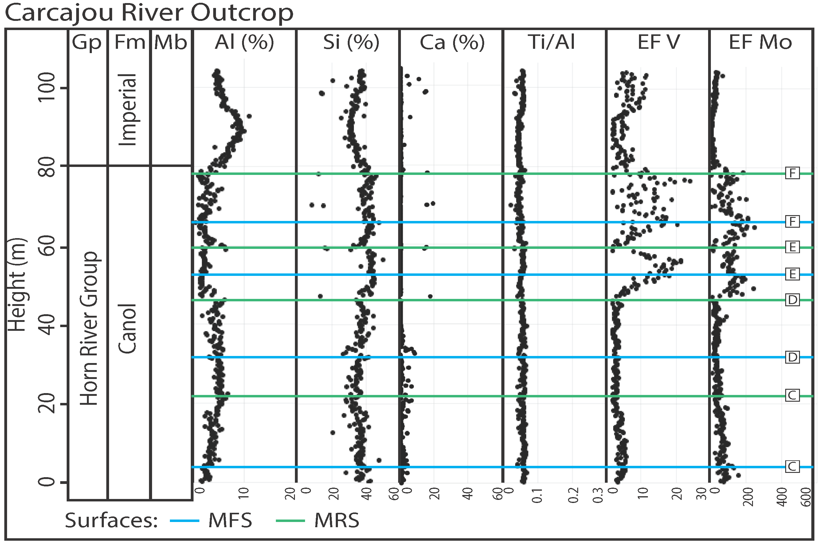Figure 9. X-ray fluorescence (XRF) results from the Carcajou River outcrop. Acronyms and abbreviations: Gp – group; Fm – Formation, Mb – Member; EF V – V enrichment factor; EF Mo – Mo enrichment factor; MFS – maximum flooding surface; and MRS – maximum regressive surface.