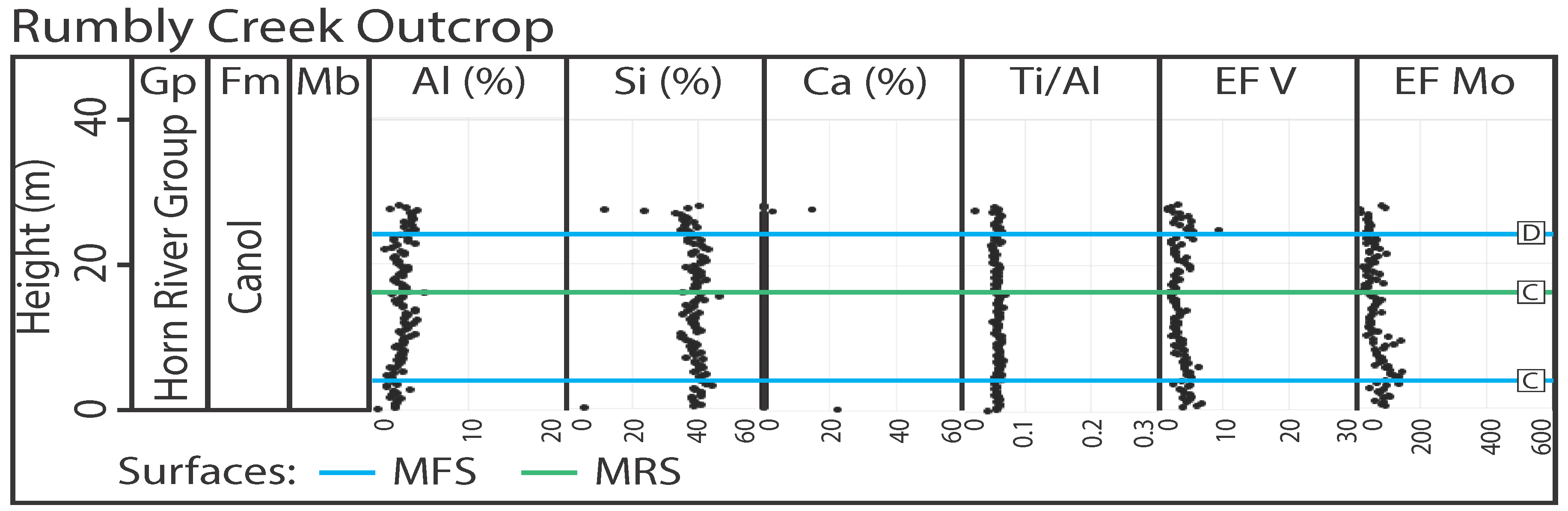 Only a short section of the Canol Formation was accessible at Rumbly Creek. This interval is marked by subtle fluctuations in Al, Si, EF V, and EF Mo. As observed in other cores and outcrops, Al and Si show similar but opposite trends to one another. Calcium and the Ti/Al profile are steady throughout the sampled interval, with consistently low values and little fluctuation. Moreover, patterns in the redox proxies are similar to one another, with enrichment in V at similar stratigraphic horizons as peaks in EF Mo.