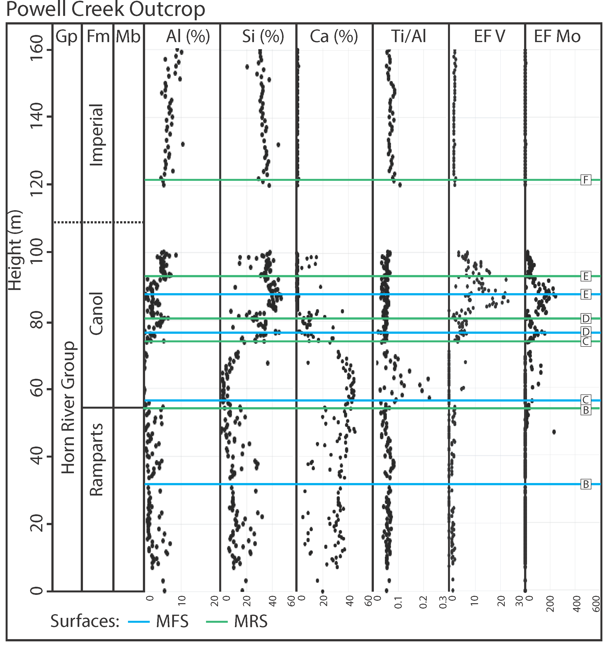 Figure 12. X-ray fluorescence (XRF) results from the Powell Creek outcrop. Acronyms and abbreviations: Gp – group; Fm – Formation, Mb – Member; EF V – V enrichment factor; EF Mo – Mo enrichment factor; MFS – maximum flooding surface; and MRS – maximum regressive surface.