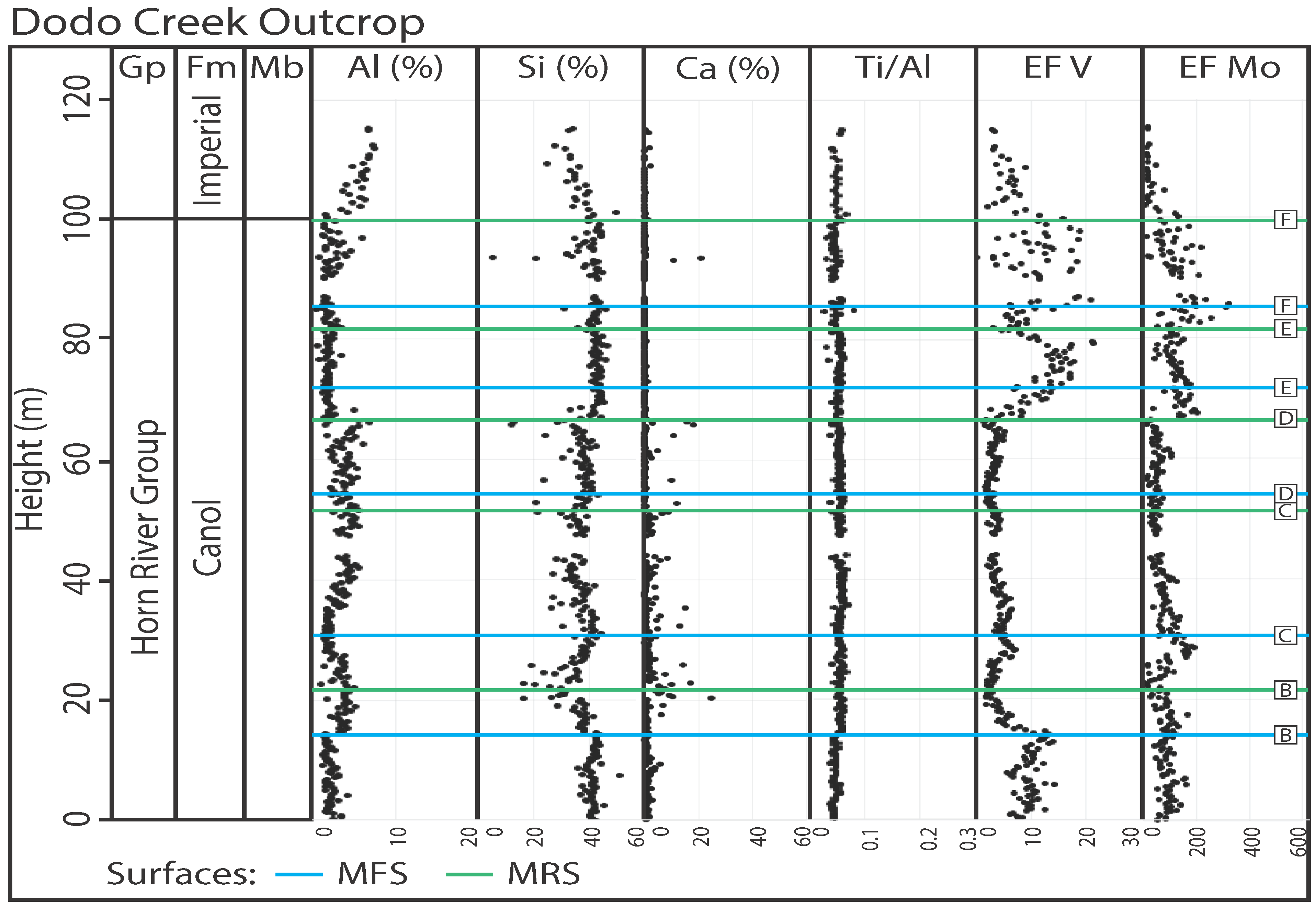 Figure 10. X-ray fluorescence (XRF) results from the Dodo Creek outcrop. Acronyms and abbreviations: Gp – group; Fm – Formation, Mb – Member; EF V – V enrichment factor; EF Mo – Mo enrichment factor; MFS – maximum flooding surface; and MRS – maximum regressive surface.