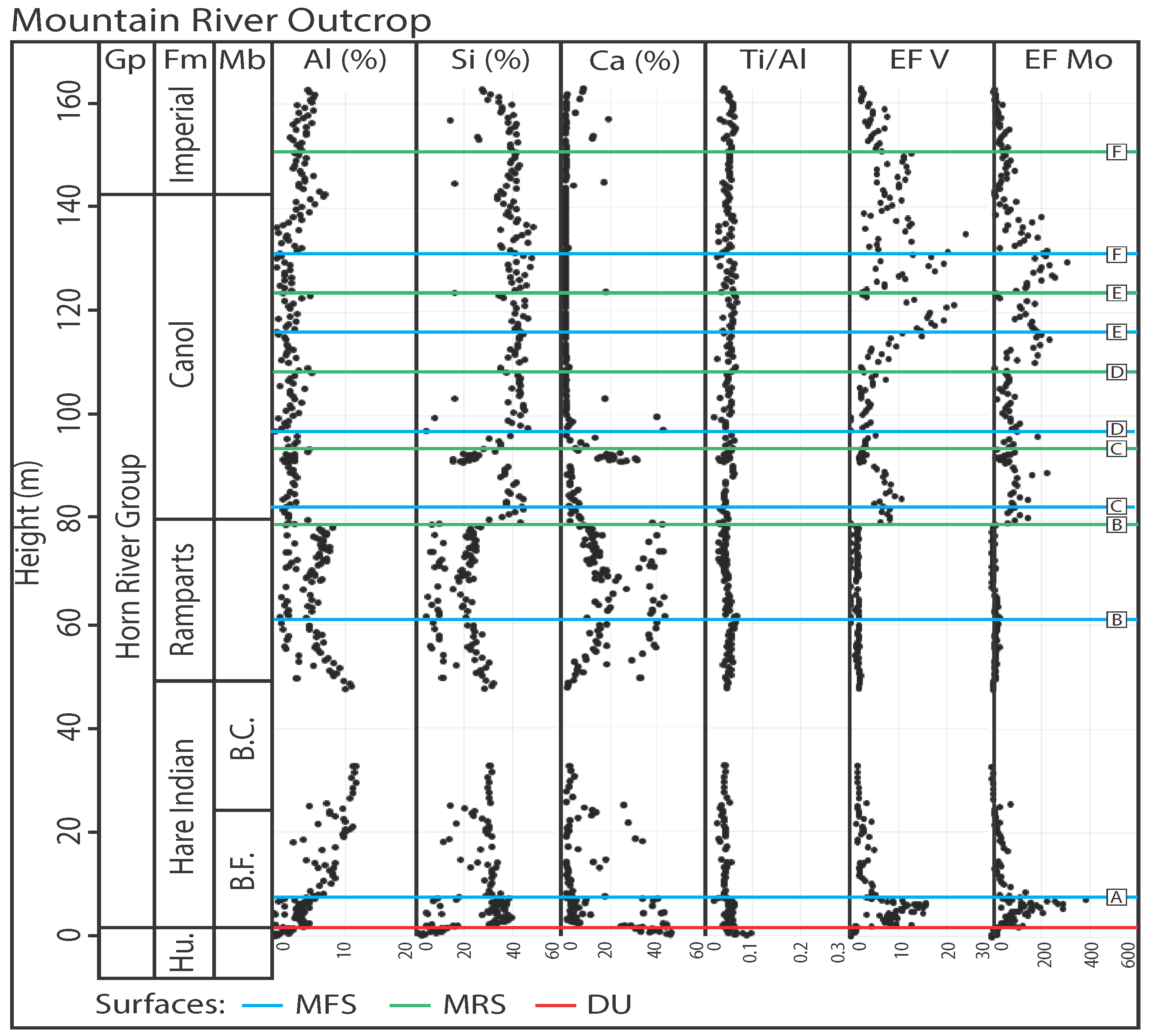 Figure 11. X-ray fluorescence (XRF) results from the Mountain River outcrop. Acronyms and abbreviations: Gp – group; Fm – Formation, Mb – Member; Hu. – Hume; B.F. – Bluefish; B.C. – Bell Creek; EF V – V enrichment factor; EF Mo – Mo enrichment factor; MFS – maximum flooding surface; MRS – maximum regressive surface, and DU – drowning unconformity.