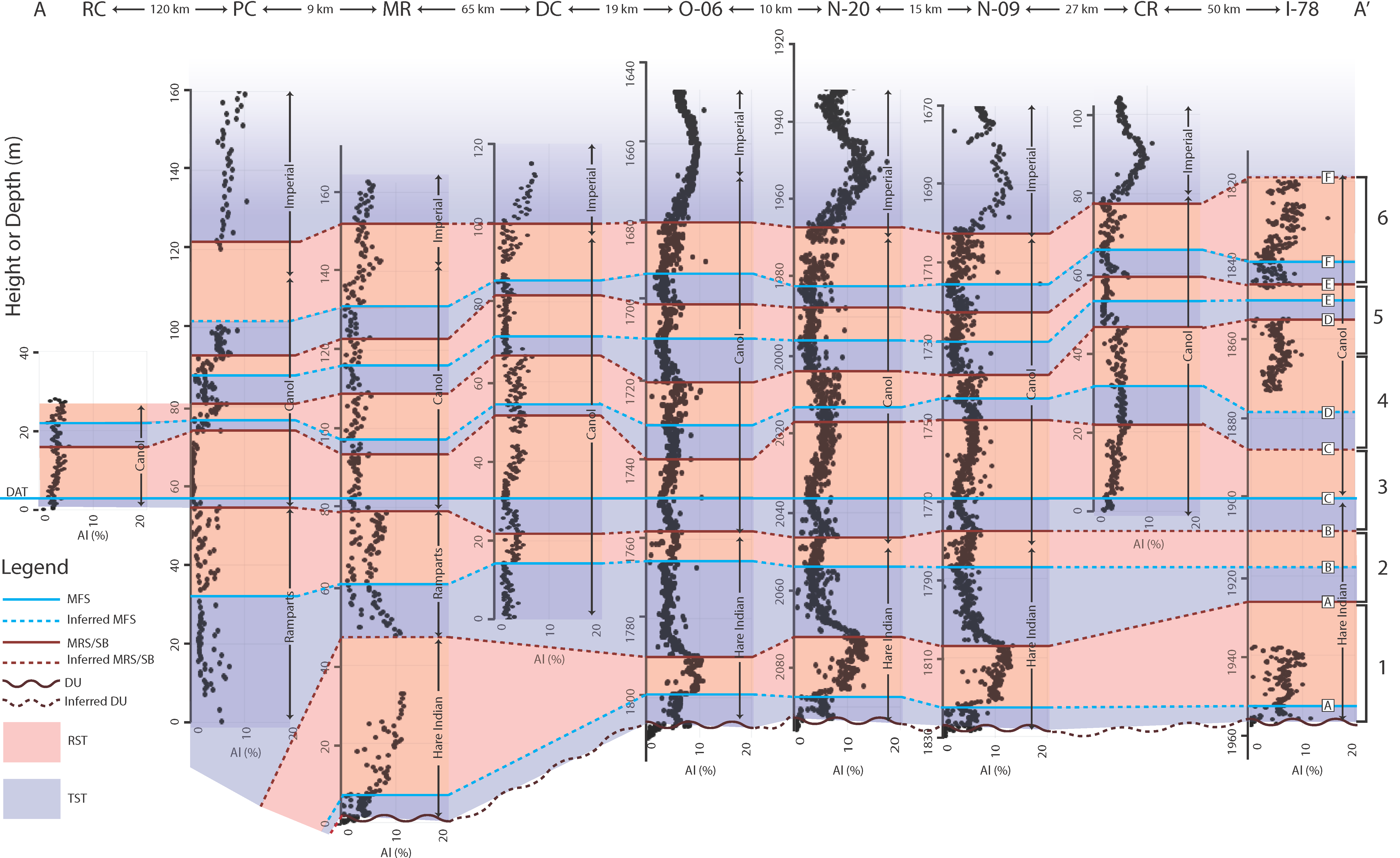 Initial studies of the Horn River Group focused on the Kee Scarp Reef Member of the Rampart Formation, placing these reef strata in the context of two large-scale sequence stratigraphic cycles (e.g., Muir et al., 1985). The Horn River Group has also been included in a broad-scale sequence stratigraphic framework for the Devonian of the entire Northern Canadian Mainland Sedimentary Basin, where the Horn River Group and surrounding formations are part of two transgressive-regressive (T-R) cycles (Morrow, 2018). Broadly, the two cycles of Muir and Morrow are as follows: (1) Hume Formation to Hare Indian Formation or lower Ramparts Formation, (2) Hare Indian Formation or lower Ramparts Formation to Imperial Formation (Morrow, 2018; Muir et al., 1985), although specific details about the proposed boundaries between the transgressive and regressive portion of the cycles are limited. Using lithofacies interpretations and well-log datasets, Potma et al. (2022) interpreted a depositional sequence largely consistent with the second cycle above, spanning the upper Ramparts Formation to the lowermost Imperial Formation. At locations where the carbonate units are thick and the overlying Canol Formation mudstone unit is thin, higher-frequency cycles were identified in carbonates of the Ramparts Formation, in the form of alternating transgressive systems tracts and highstand systems tracts (e.g., Muir et al., 1985; Muir & Dixon, 1984) or in the form of parasequences (Yose et al., 2001). Moreover, a chemostratigraphy-based sequence stratigraphic framework for the Hare Indian Formation (the lowermost unit of the Horn River Group) was presented by Harris et al. (2021). High-frequency stratigraphic cycles have not previously been identified and correlated in the organic-rich mudstone units of the Canol Formation or the Horn River Group as a whole.